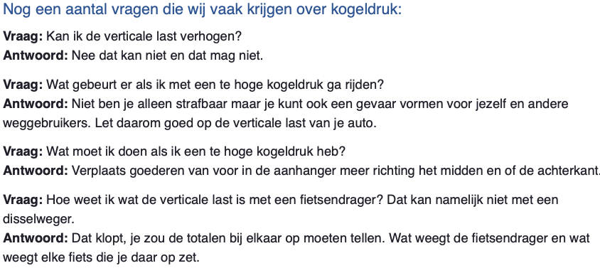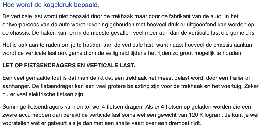 Dat klopt dus niet! En zie ook: https://trekhaken.nu/kennisbank/gebruik ... ek-checkenSyncRoon schreef: 17 mei 2025, 20:05 Volgens mij is het zo dat de kogeldruk van VW bepalend is voor de maximale kogeldruk van een aanhanger. Bij een lastdrager (fietsendrager) gaat het mijn inziens om de door de trekhaak fabrikant vermelde maximale kogeldruk.
