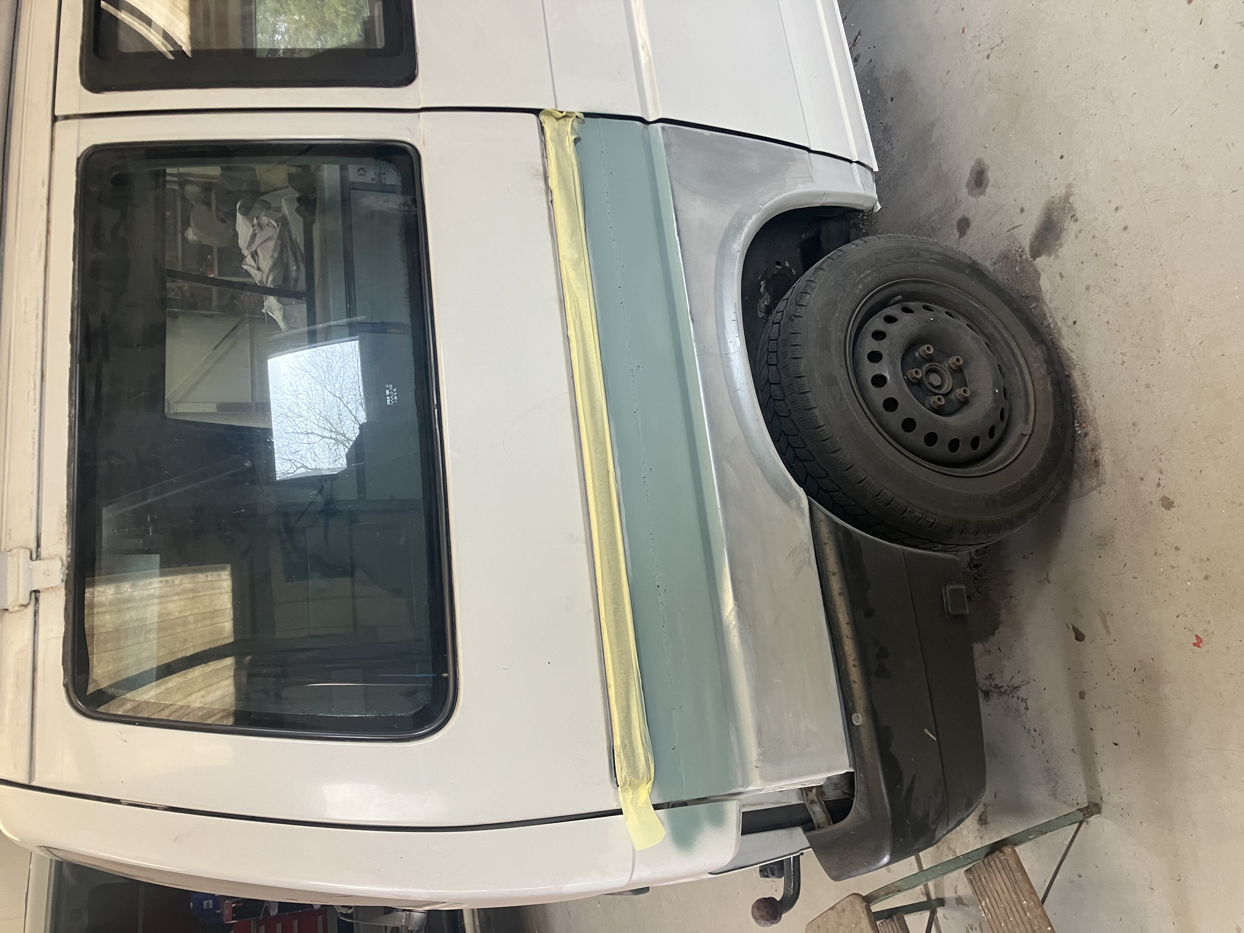 Achterkant ook maar ff gecheckt: daar bleek ook water door te komen en roest vooral linksachter behoorlijk aanwezig. Hier bijgewerkt, primer, aflak, en daarna de rubber blokjes van voor op maat gemaakt voor achter. Sikaflex ertussen en langs de naden en zou weer goed dicht moeten zijn. Voorkant is later nog geplamuurd bij de spuiter, daar deel ik later nog wel wat van