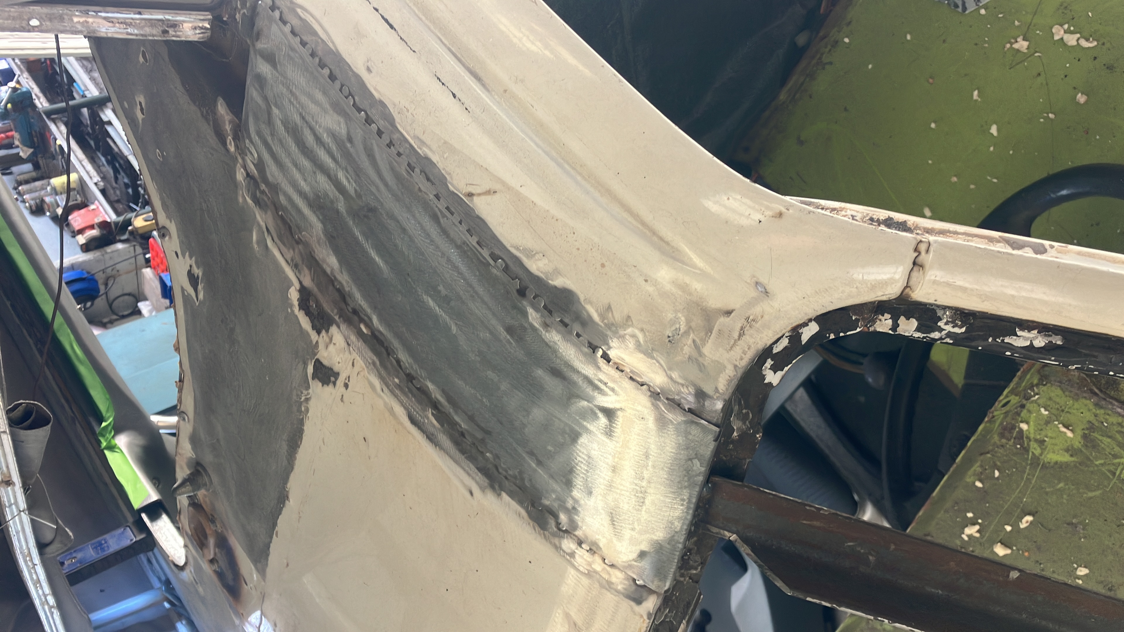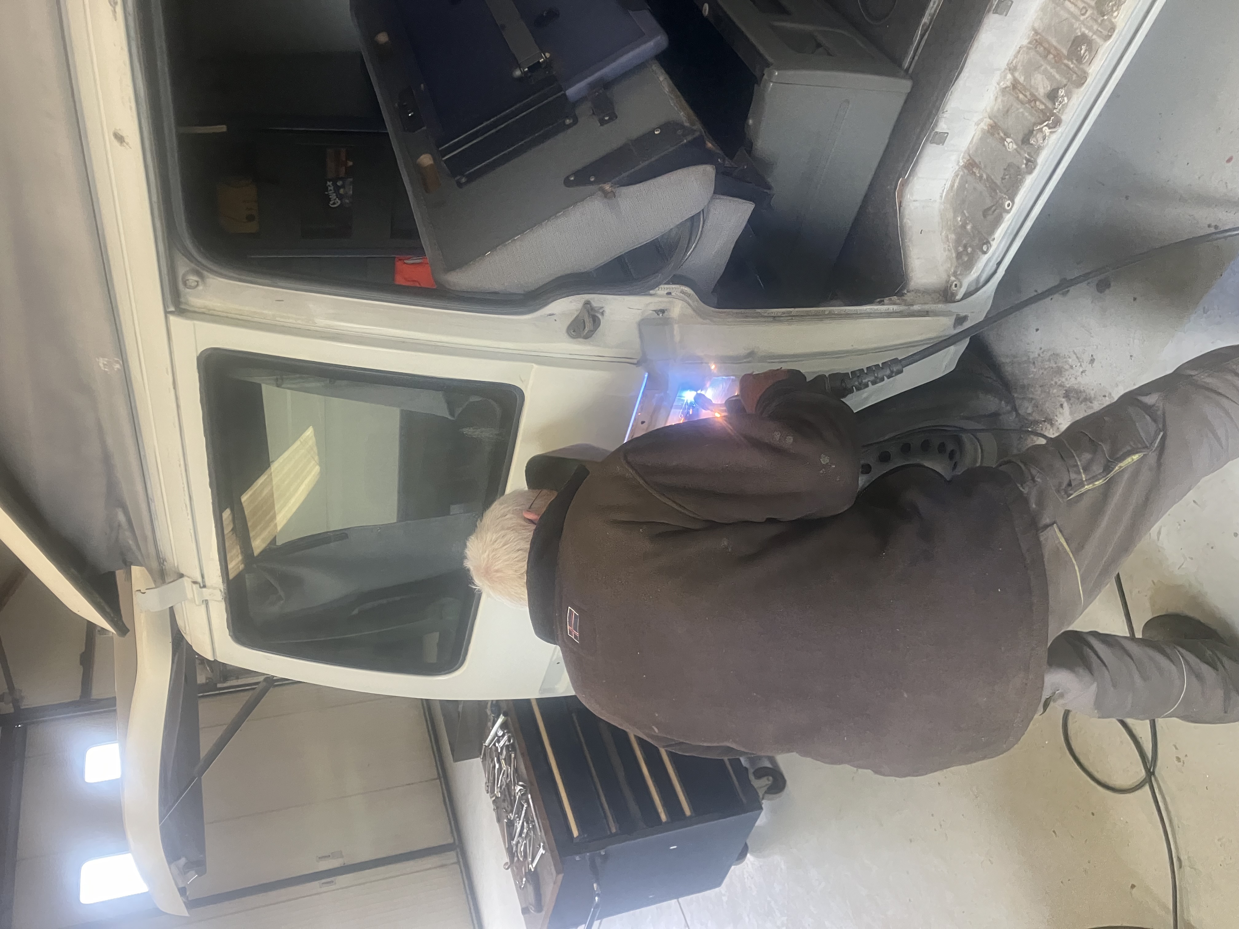 A stijl uit donor bus geslepen en erin gezet, met hulp van ervaren lasser Richard.