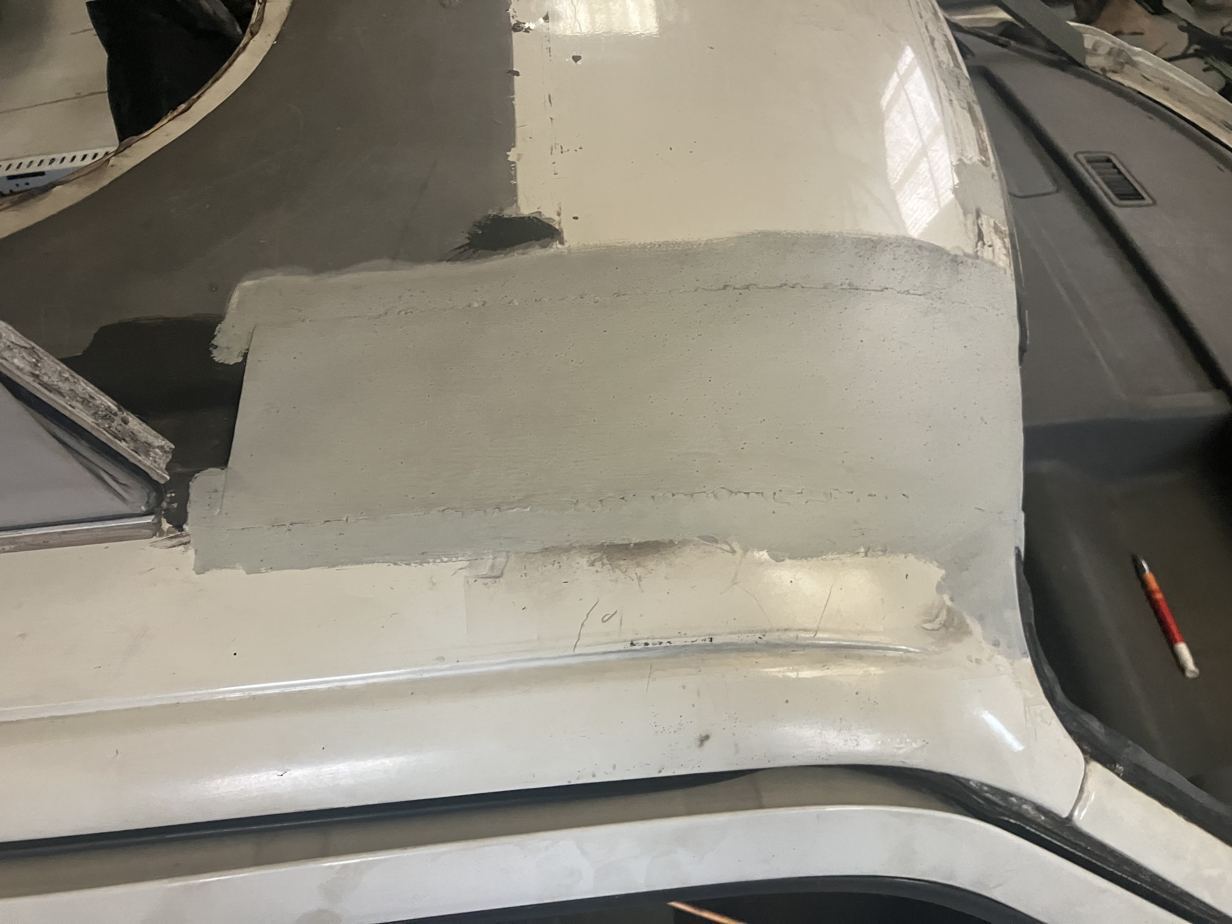 Na het grote laswerk, herstel A stijl en paravan vervanging, bij de spuiter alle voorbereiding qua schuren zelf gedaan. Ook hefdak geschuurd. Daarna afgeplakt en is er laag epoxy primer op gegaan.