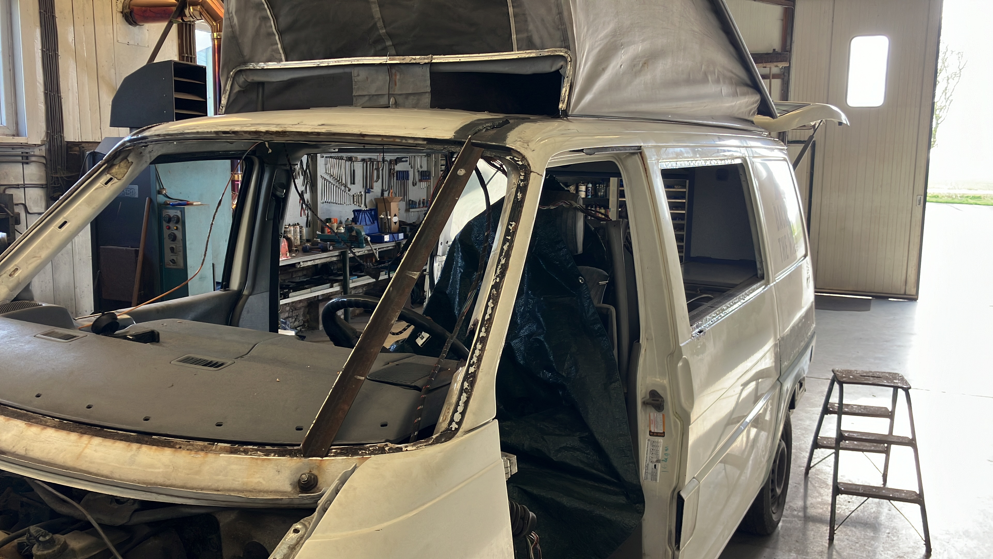 Na het eruit halen van de voorruit (helaas gebroken bij verwijderen) bleek de roest vooral bij de paravan het ergste. Daar nieuw deel voor besteld via Poolse site. Oude deel laten zitten maar wel het deel van de rand van de ruit weggeslepen. Nieuwe deel daar overheen gezet en vast gelast. Op deze manier stond het chassis nummer er ook nog steeds gewoon in