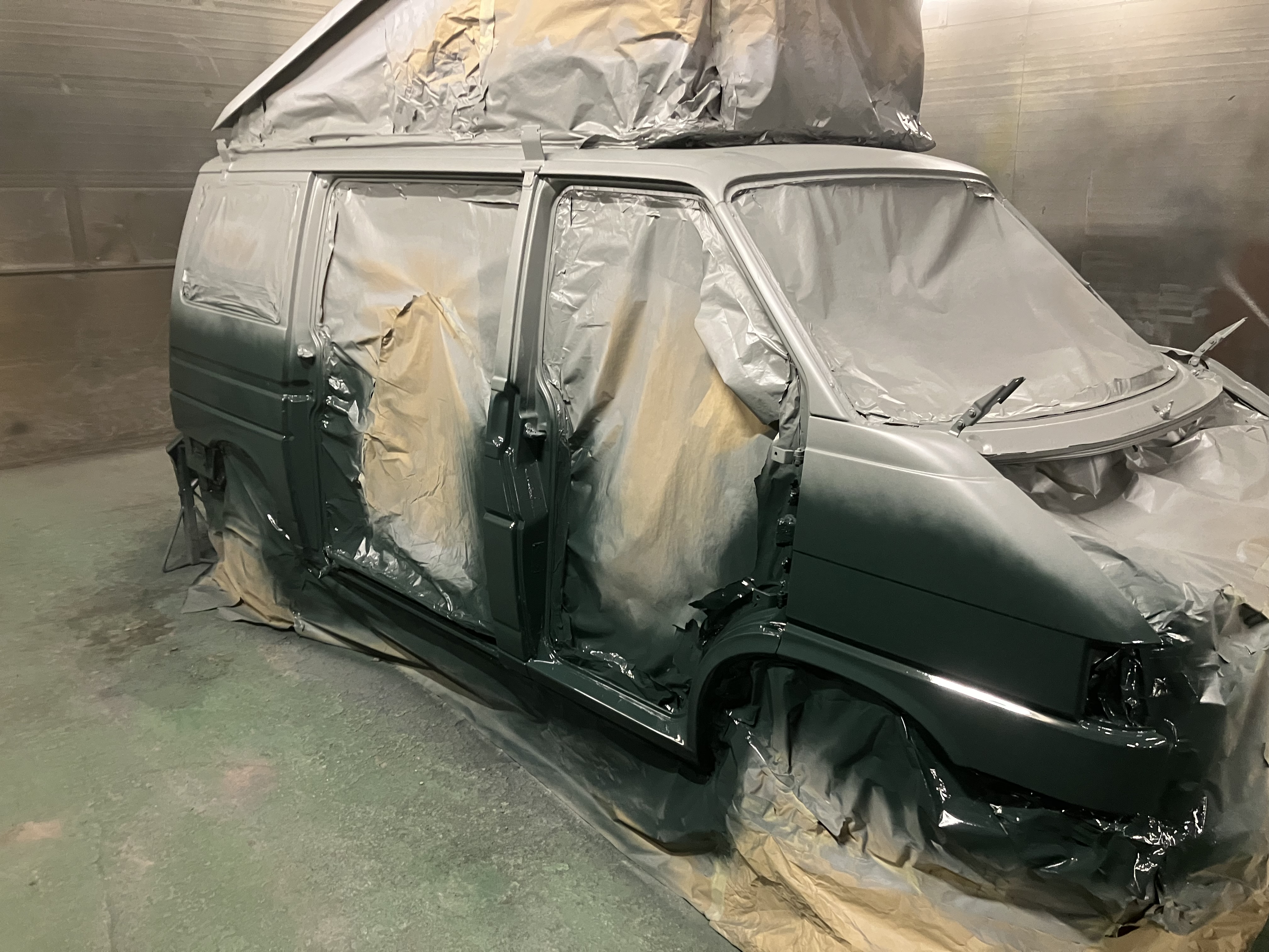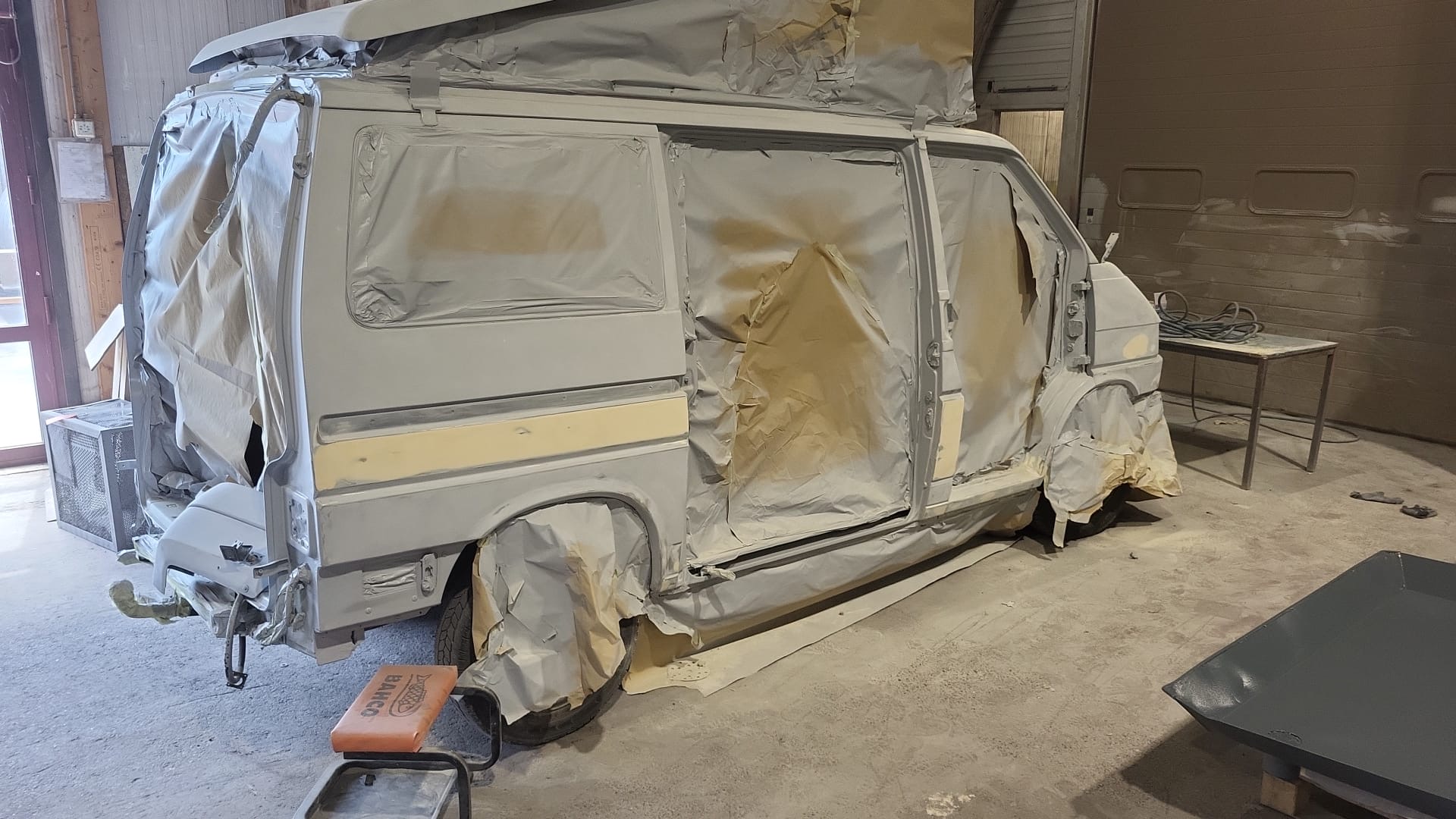 Na de eerste laag heeft de spuiter geplamuurd en uitgedeukt. Plamuren oa bij de plaatjes op dak aan de voorkant, de A stijl, de paravan, bumper (die ook meegespoten wordt), wielkasten voor, en raam bestuurderskant midden.