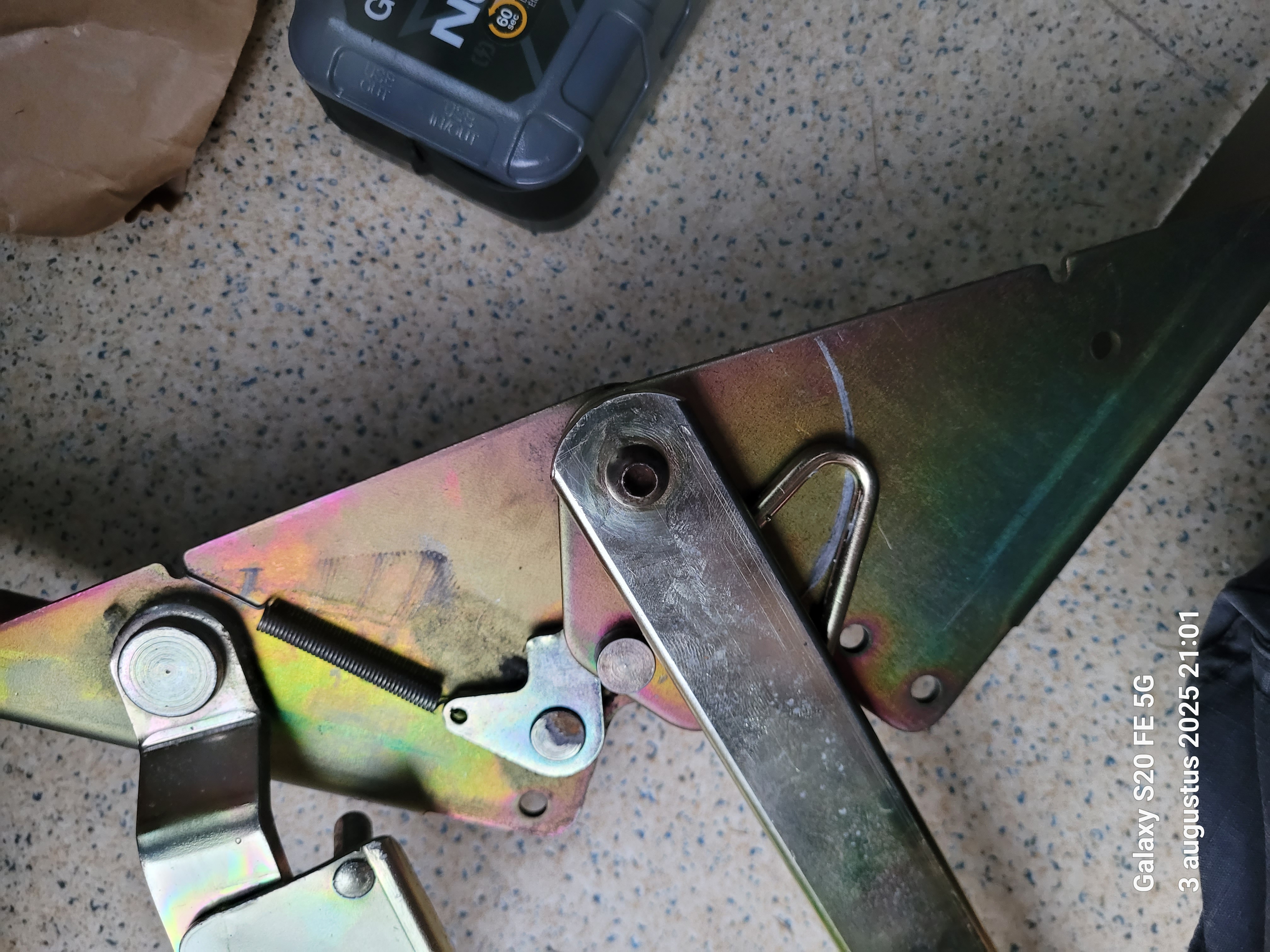Het asje heeft idd 2 diktes. Het dunste stuk was 6 mm en zat geklonken (waar nu het bolkopje te zien is). Deze uitgeboord. De rest van het asje iets kleiner geboord en M6 getapt. Ik vond nog 1 teflon ringetje de andere heb ik uit mijn vergaarbakje gehaald. Wie wat bewaard heeft wat